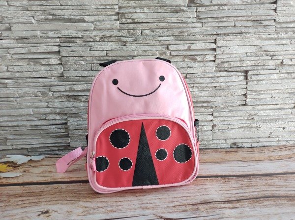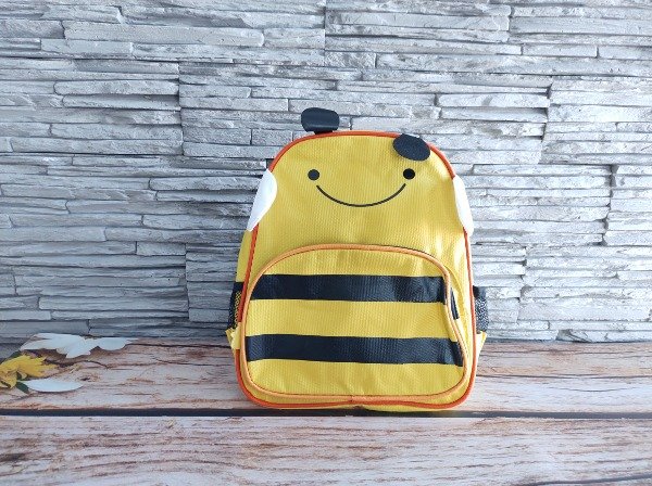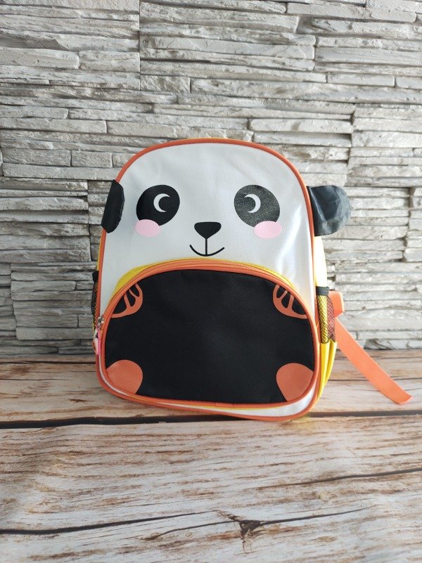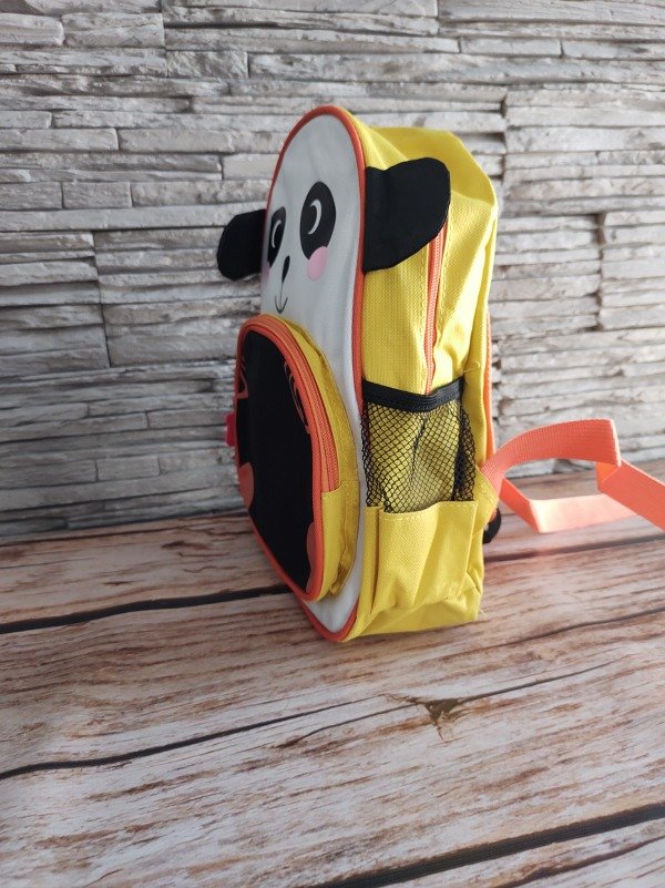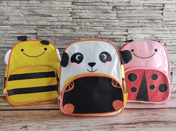 Mochila impermeable con forma de animalito y bolsillo. Tiene porta botella en los laterales.