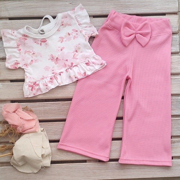 Conjunto remera de algodón peinado y pantalón Wafle. Los pantalones son larguitos.SON TALLES DE NENA.
