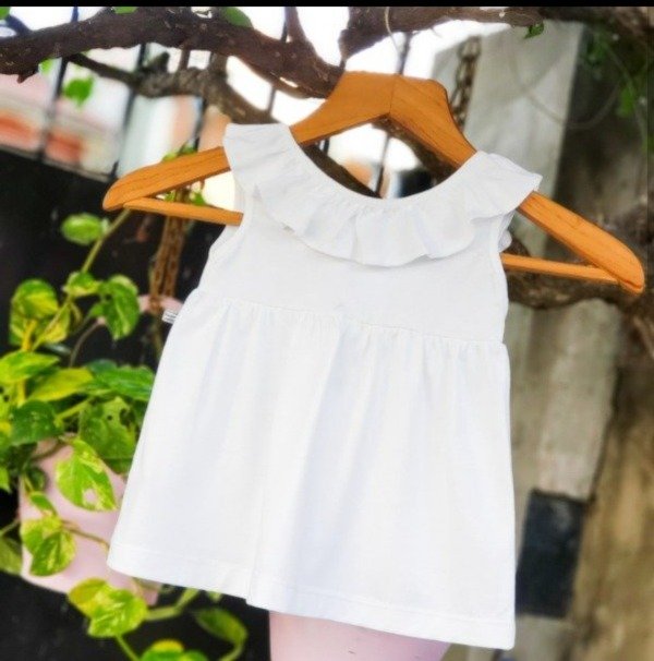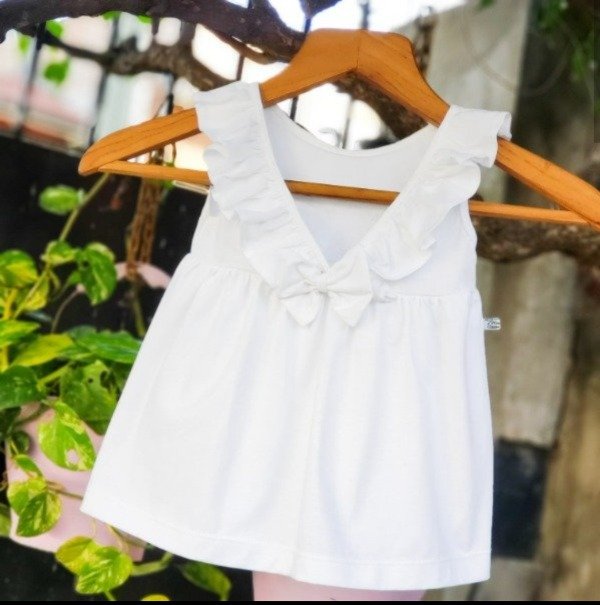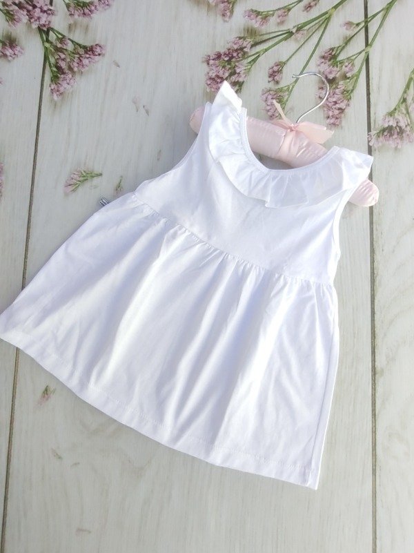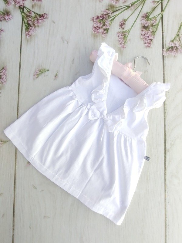 Vestido de algodón blanco con detalle de volado y moño en la espalda. Sin cambio, mirar la tabla de talles